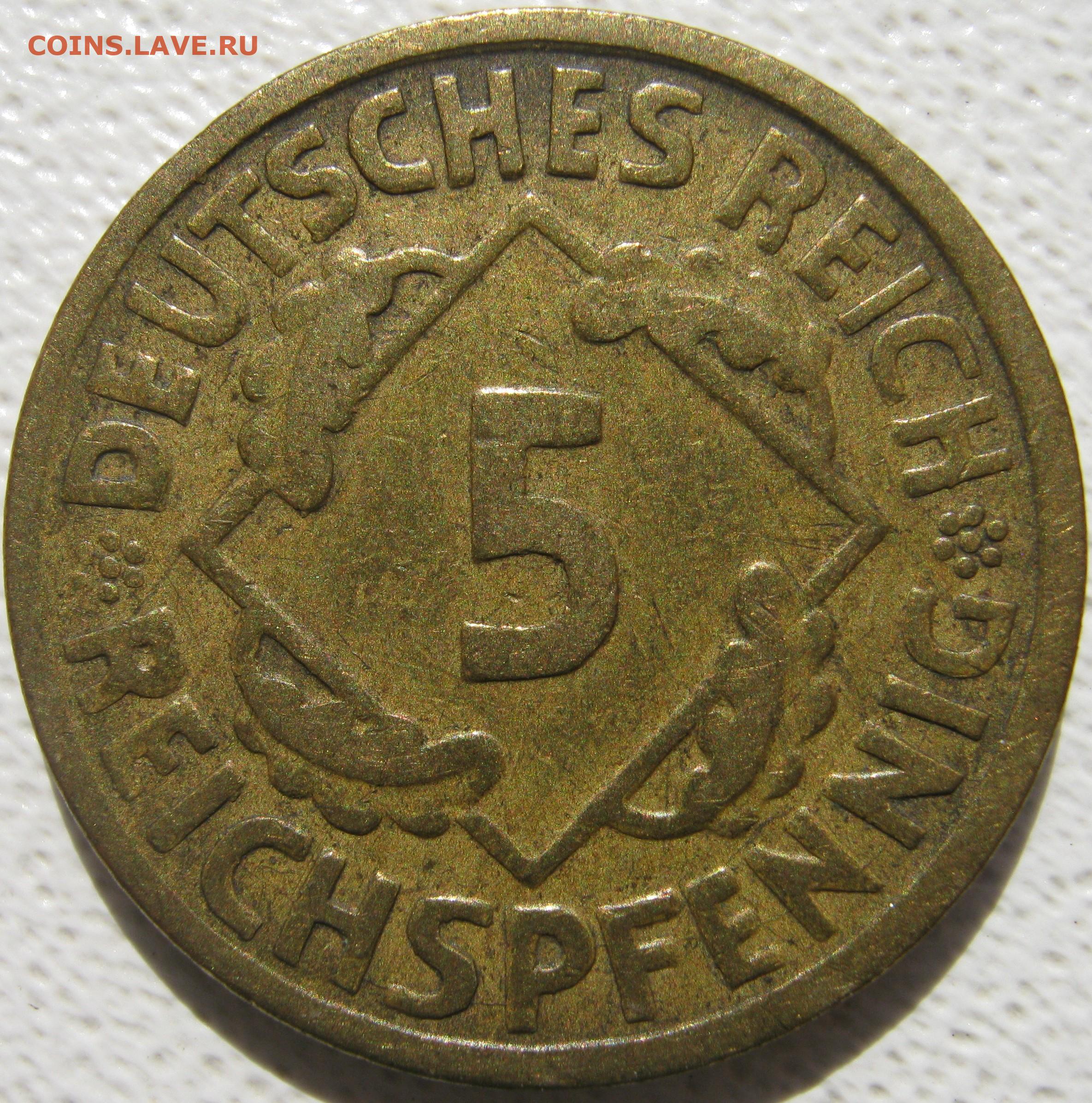 Германия Веймар 5 рейхспфеннигов 1925 F до 17.10.