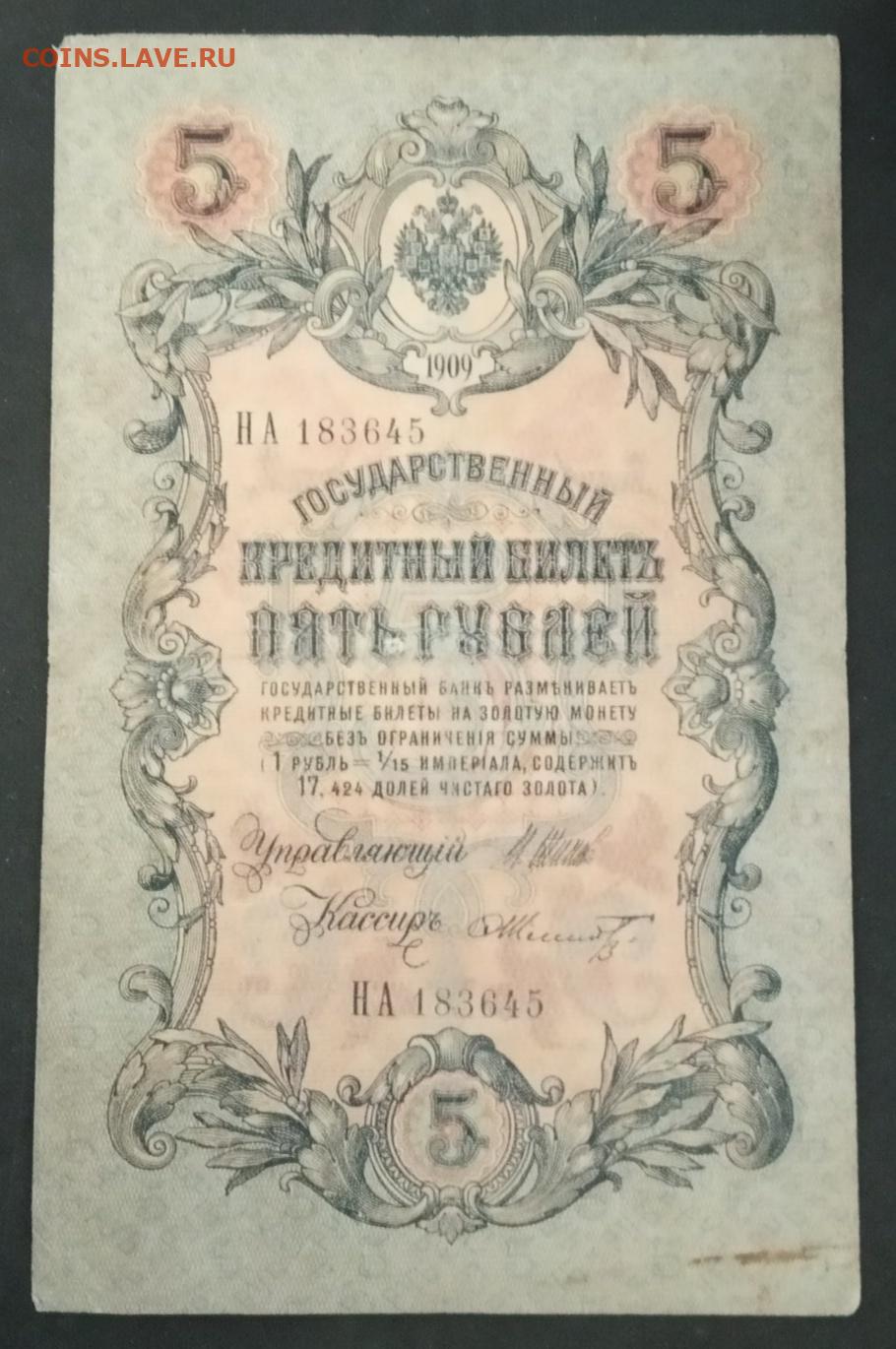 5 рублей 1909 года. Шипов Шмидт. НА183645.