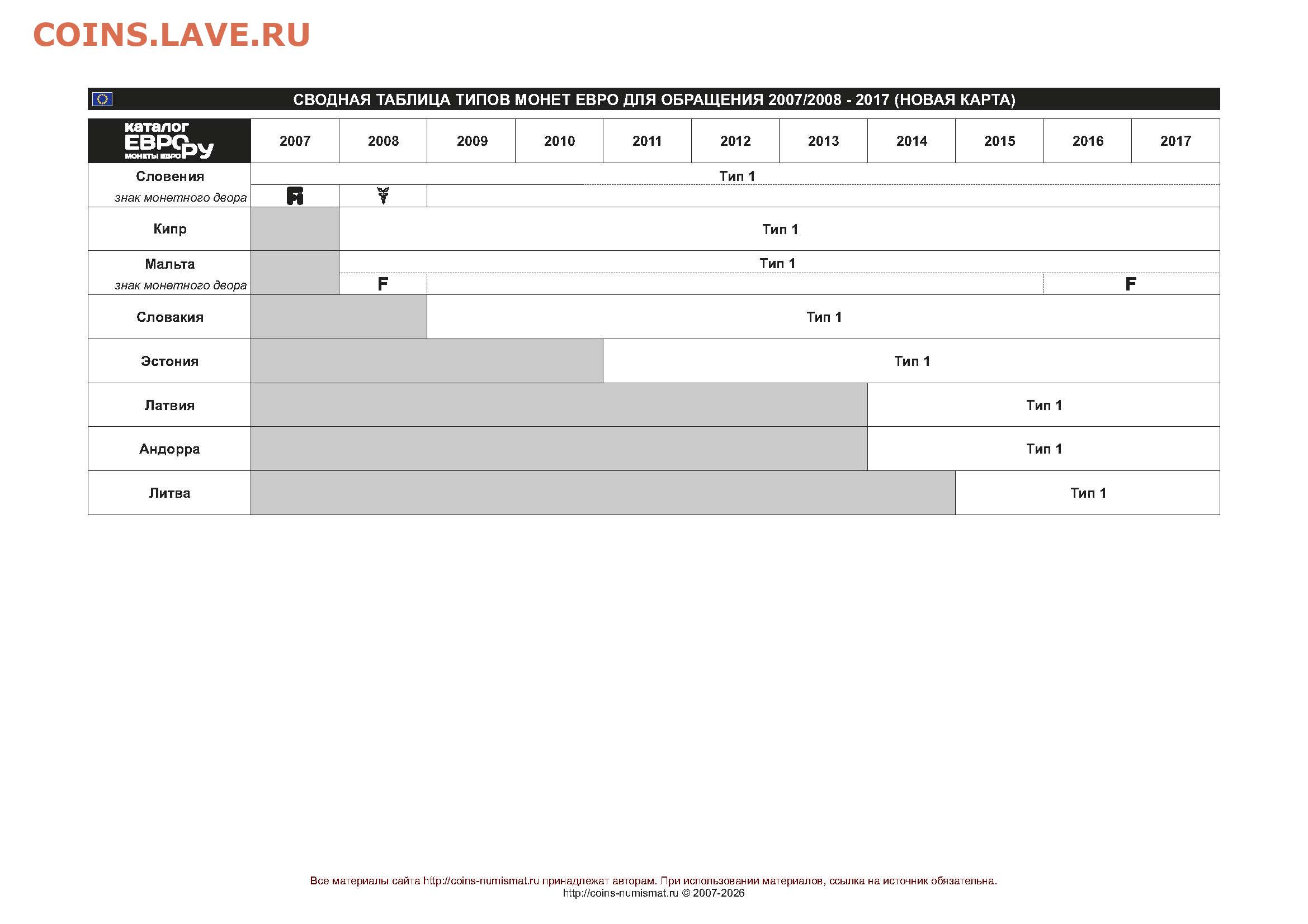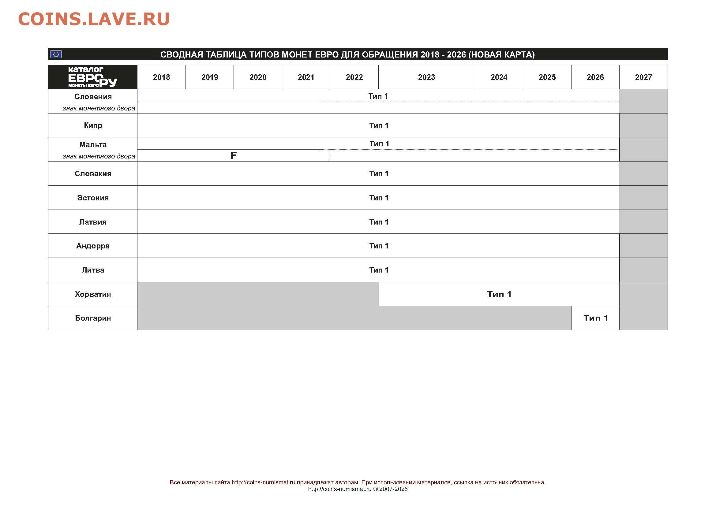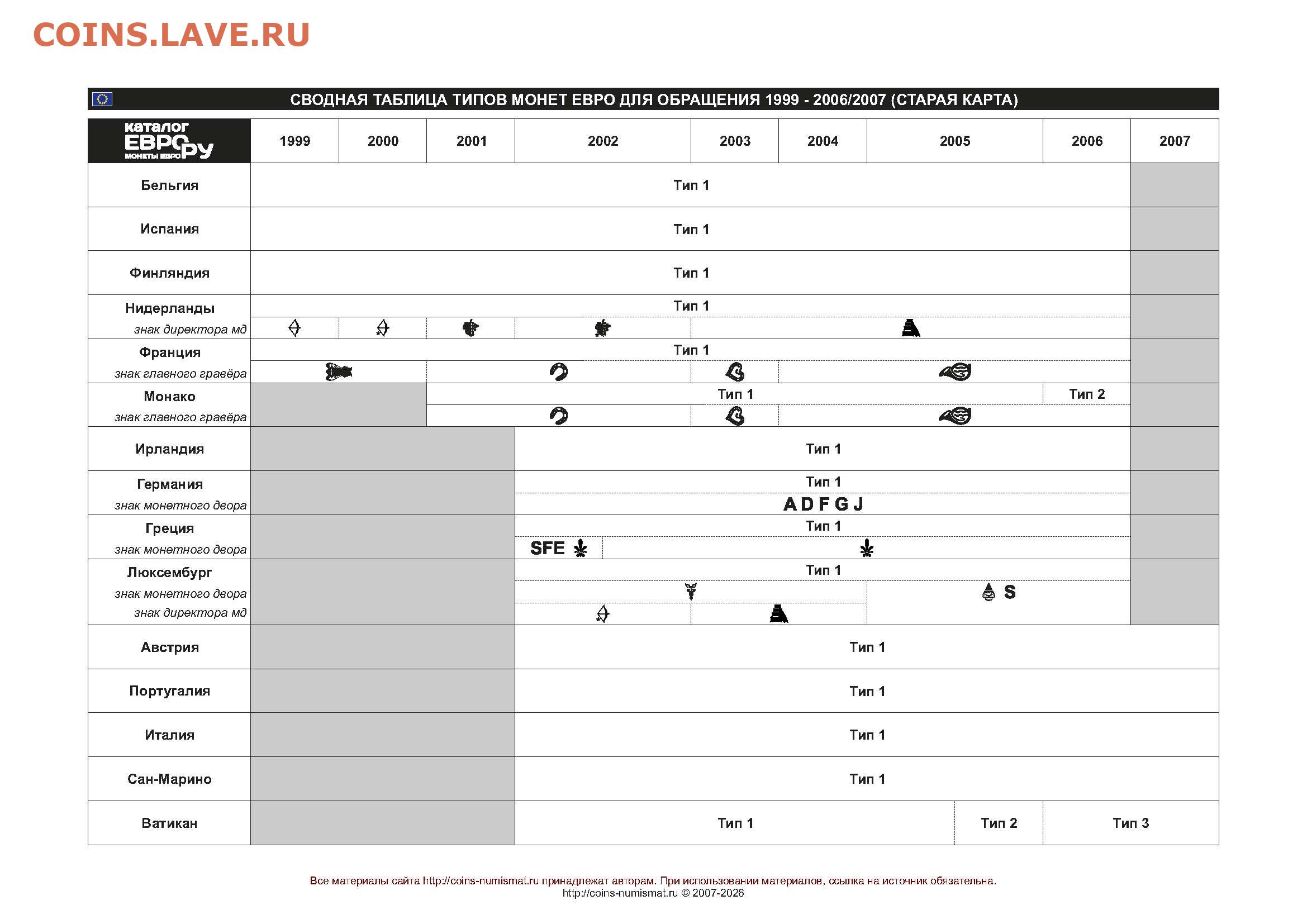 Таблица типов монет евро для обращения 1999-2026
