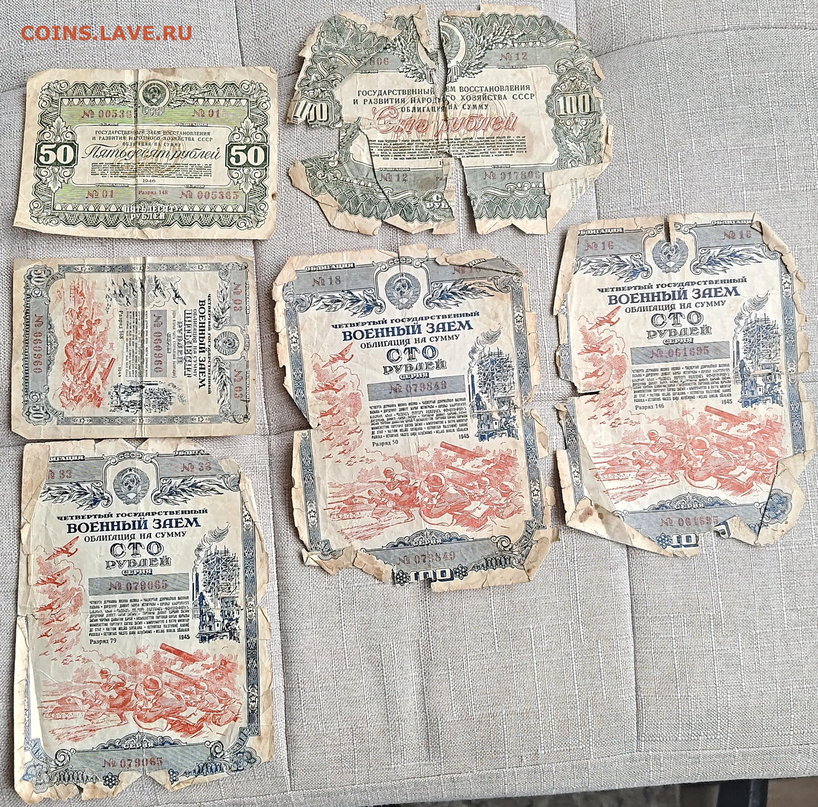 Облигации 5 шт. (ветхие, на подделки) со 100р. до 1.03